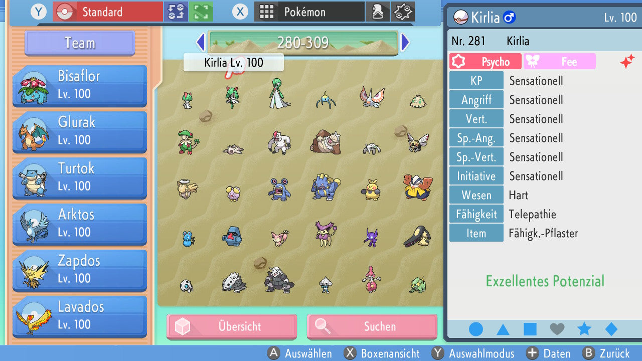 Das Pokemon ist mit beeindruckenden 6×31 IV-Werten ausgestattet. Das bedeutet, dass es auf allen sechs Werten (KP, Ang., Sp-Ang., Vert., Sp-Vert., Init.) die maximalen 31 IV/DV-Punkte besitzt. Dein Pokemon startet somit mit herausragender Stärke in digitale Kämpfe.