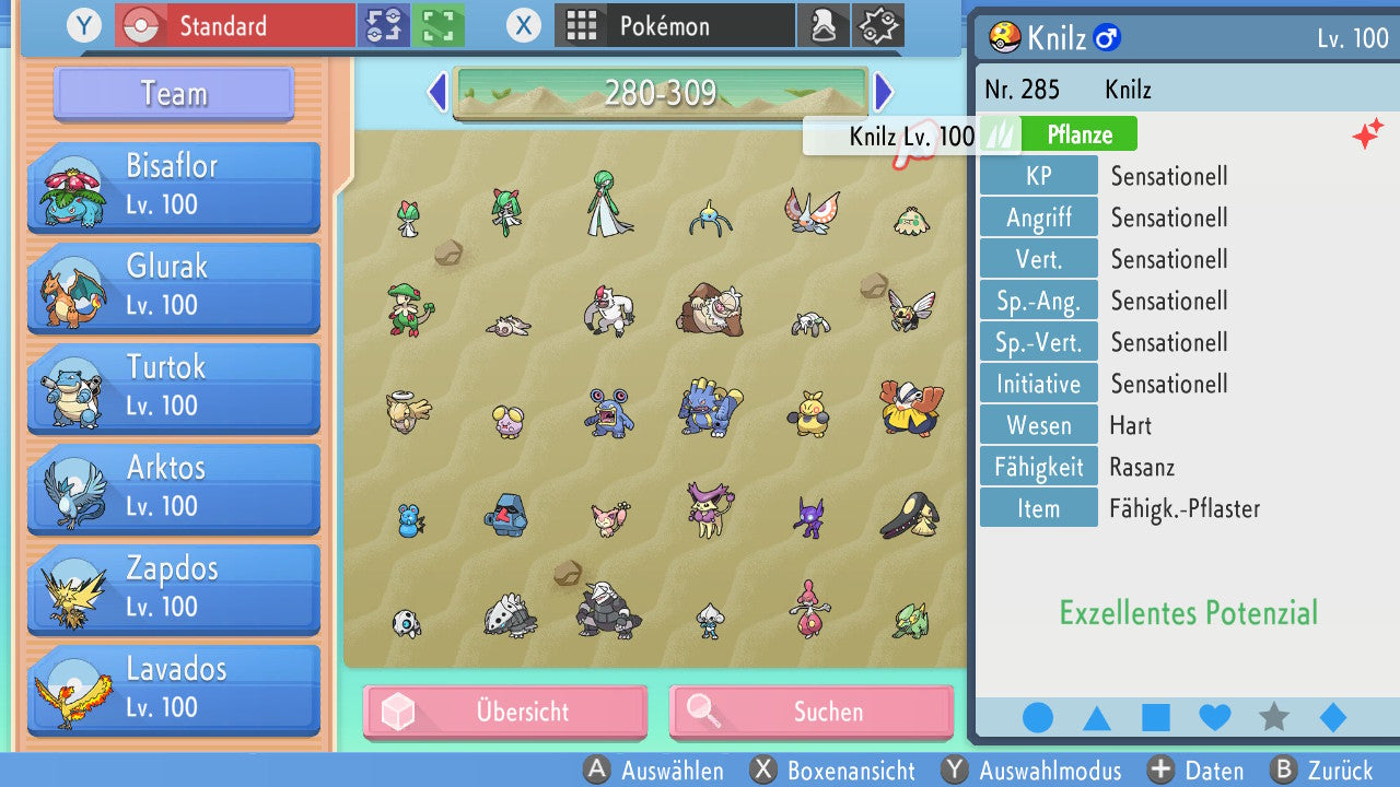 Das Pokemon ist mit beeindruckenden 6×31 IV-Werten ausgestattet. Das bedeutet, dass es auf allen sechs Werten (KP, Ang., Sp-Ang., Vert., Sp-Vert., Init.) die maximalen 31 IV/DV-Punkte besitzt. Dein Pokemon startet somit mit herausragender Stärke in digitale Kämpfe.