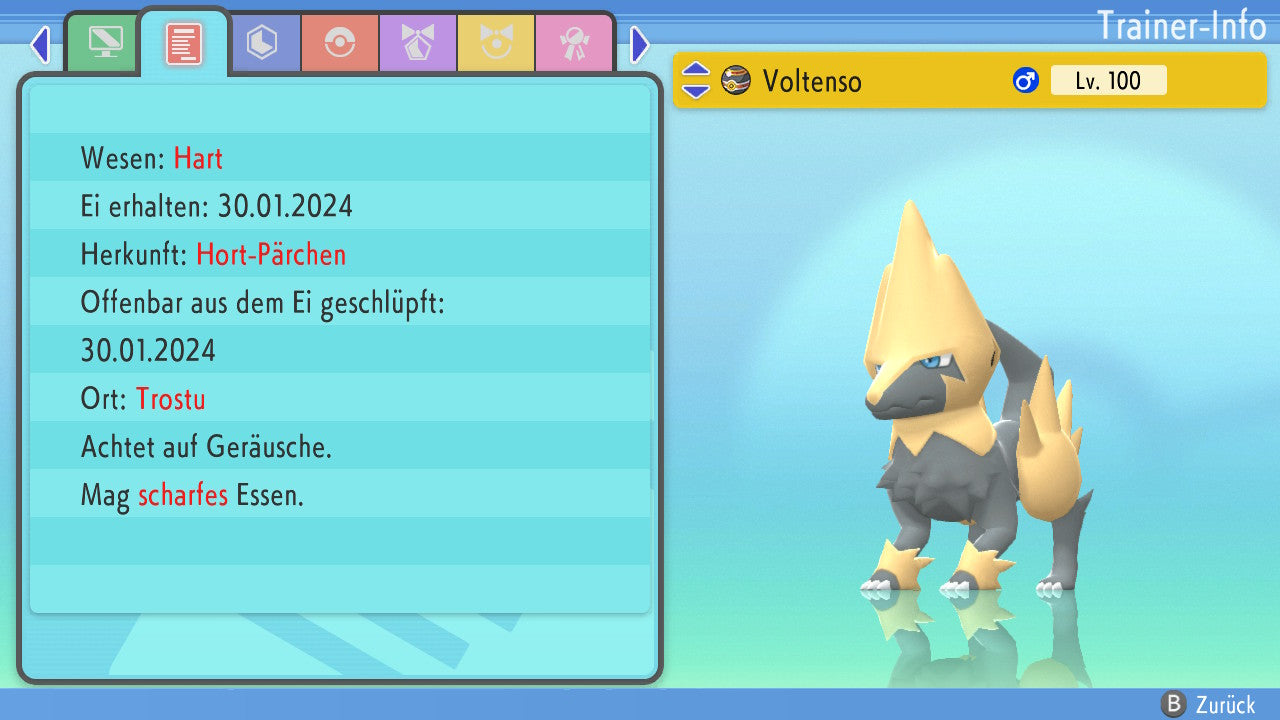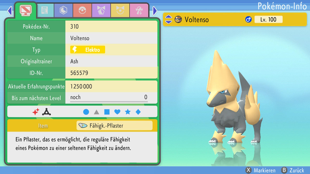 Das Pokemon ist mit beeindruckenden 6×31 IV-Werten ausgestattet. Das bedeutet, dass es auf allen sechs Werten (KP, Ang., Sp-Ang., Vert., Sp-Vert., Init.) die maximalen 31 IV/DV-Punkte besitzt. Dein Pokemon startet somit mit herausragender Stärke in digitale Kämpfe.