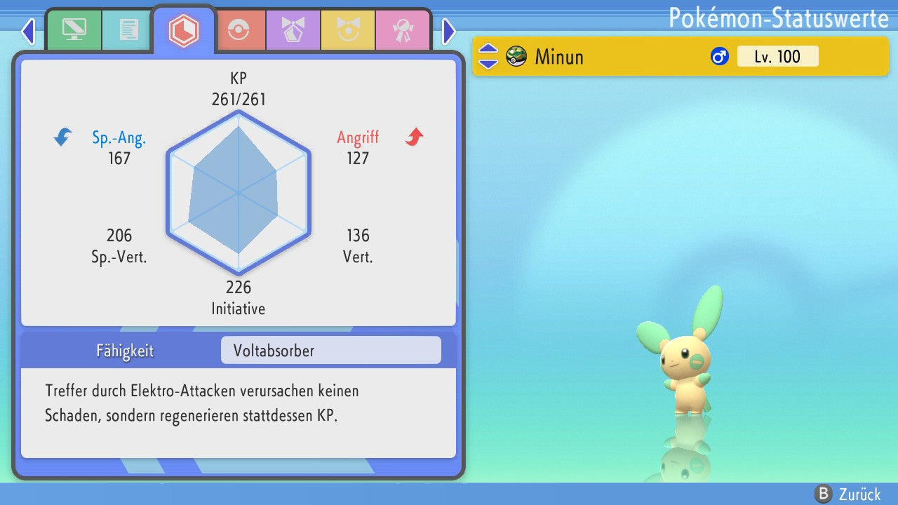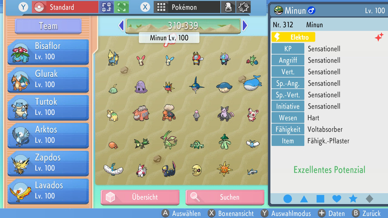 Das Pokemon ist mit beeindruckenden 6×31 IV-Werten ausgestattet. Das bedeutet, dass es auf allen sechs Werten (KP, Ang., Sp-Ang., Vert., Sp-Vert., Init.) die maximalen 31 IV/DV-Punkte besitzt. Dein Pokemon startet somit mit herausragender Stärke in digitale Kämpfe.
