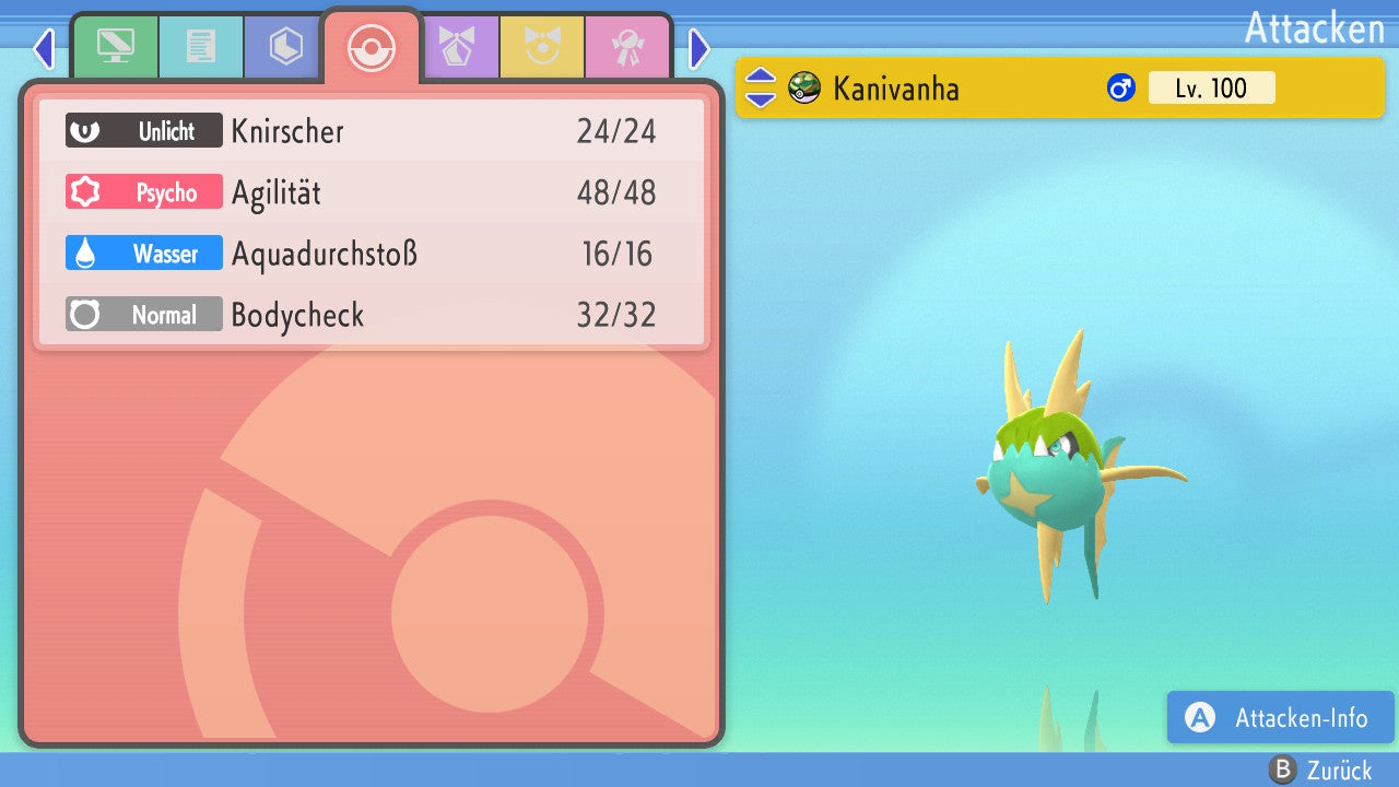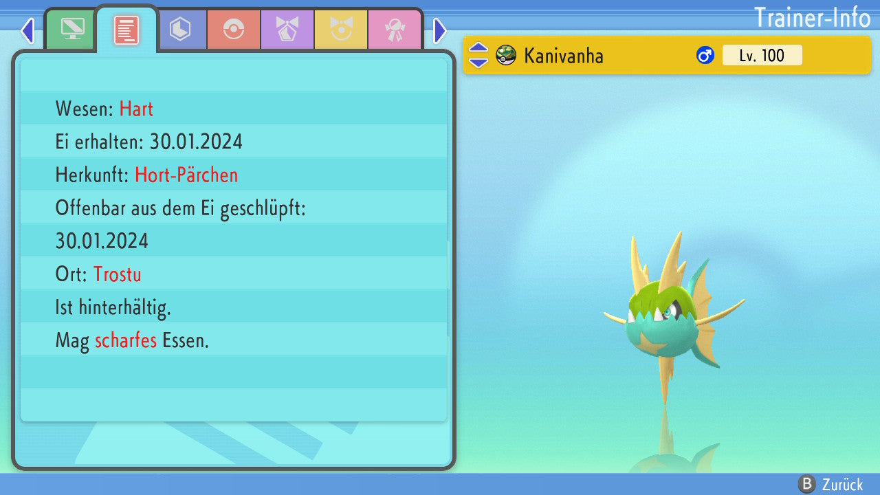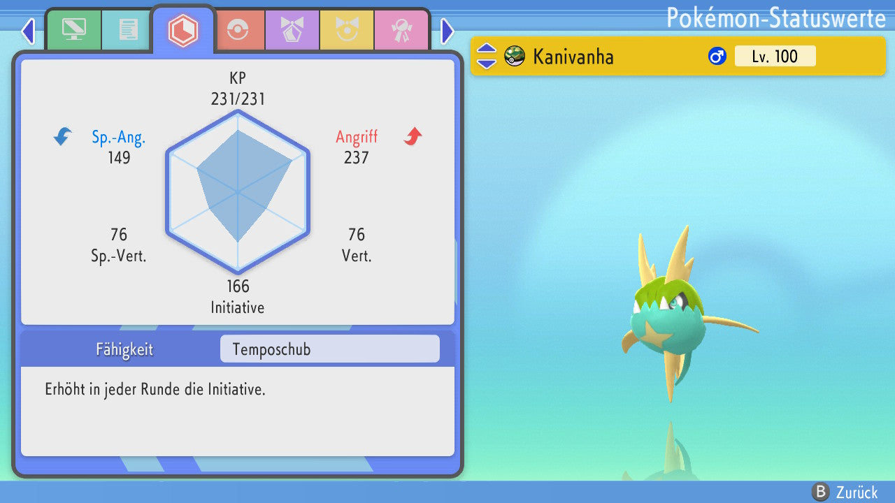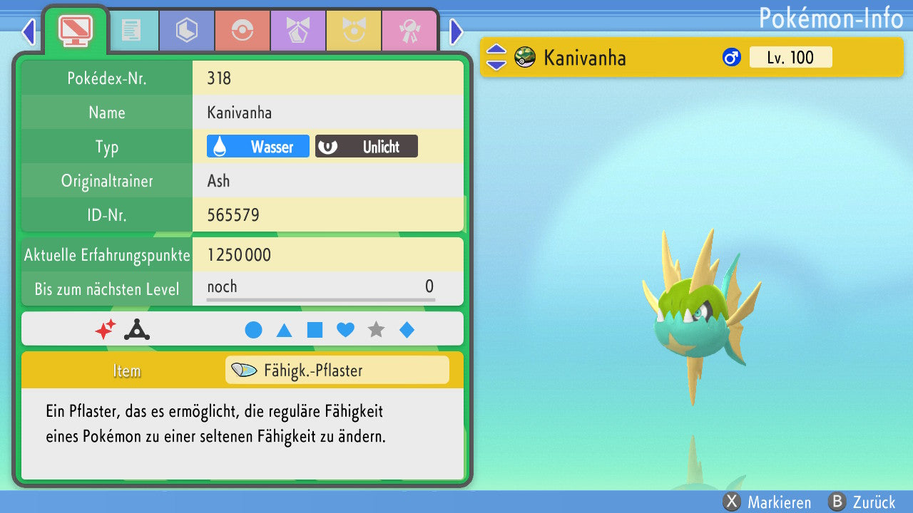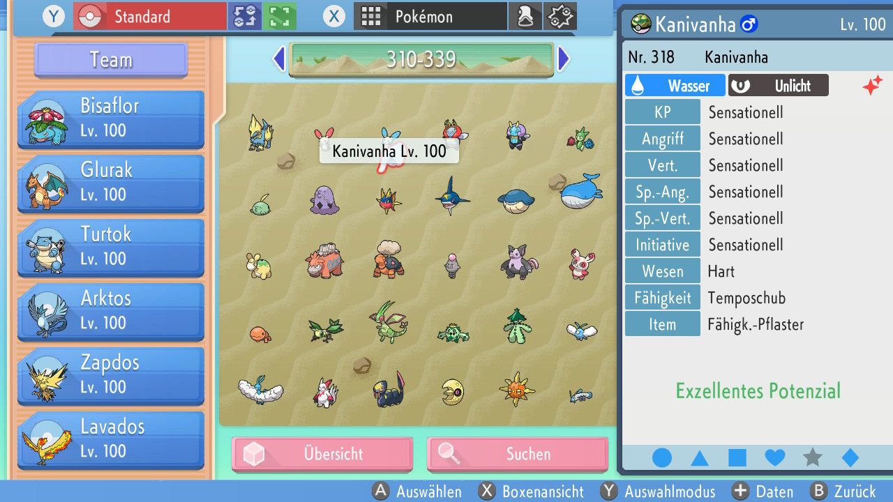 Das Pokemon ist mit beeindruckenden 6×31 IV-Werten ausgestattet. Das bedeutet, dass es auf allen sechs Werten (KP, Ang., Sp-Ang., Vert., Sp-Vert., Init.) die maximalen 31 IV/DV-Punkte besitzt. Dein Pokemon startet somit mit herausragender Stärke in digitale Kämpfe.