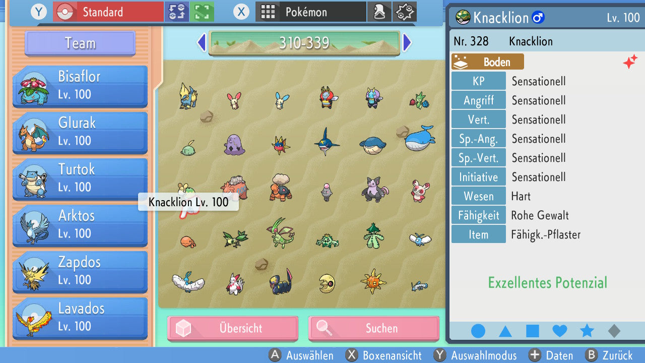 Das Pokemon ist mit beeindruckenden 6×31 IV-Werten ausgestattet. Das bedeutet, dass es auf allen sechs Werten (KP, Ang., Sp-Ang., Vert., Sp-Vert., Init.) die maximalen 31 IV/DV-Punkte besitzt. Dein Pokemon startet somit mit herausragender Stärke in digitale Kämpfe.