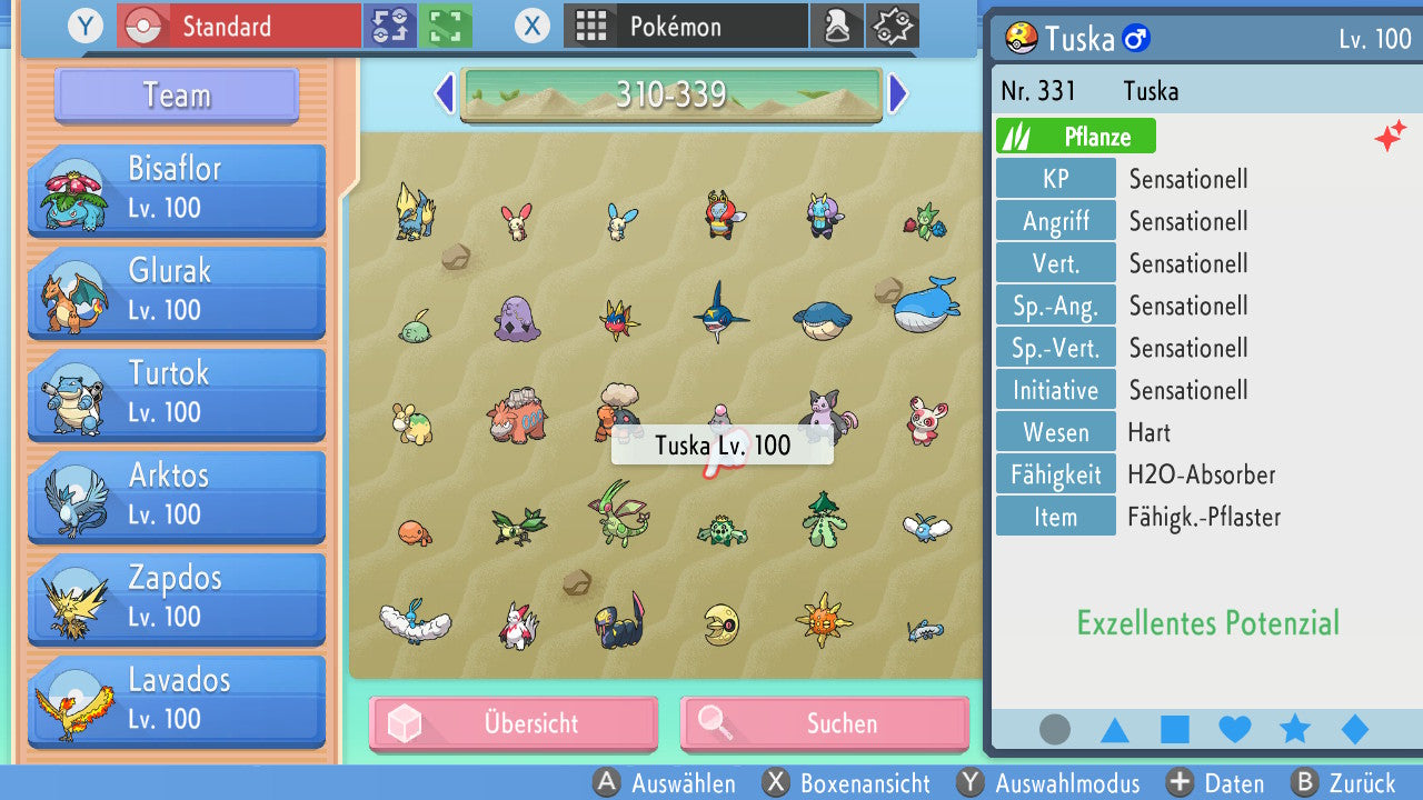 Das Pokemon ist mit beeindruckenden 6×31 IV-Werten ausgestattet. Das bedeutet, dass es auf allen sechs Werten (KP, Ang., Sp-Ang., Vert., Sp-Vert., Init.) die maximalen 31 IV/DV-Punkte besitzt. Dein Pokemon startet somit mit herausragender Stärke in digitale Kämpfe.