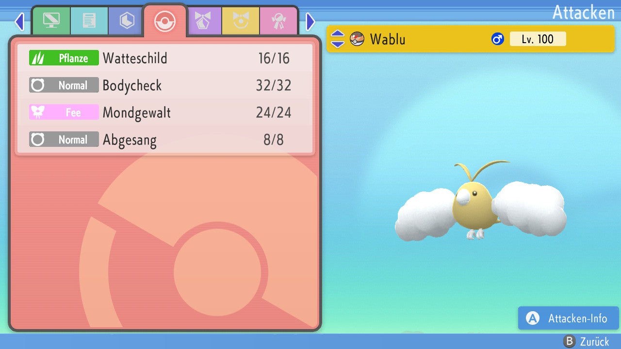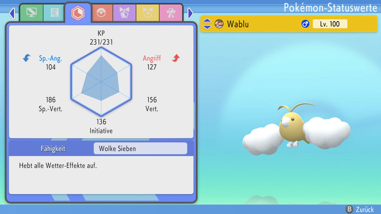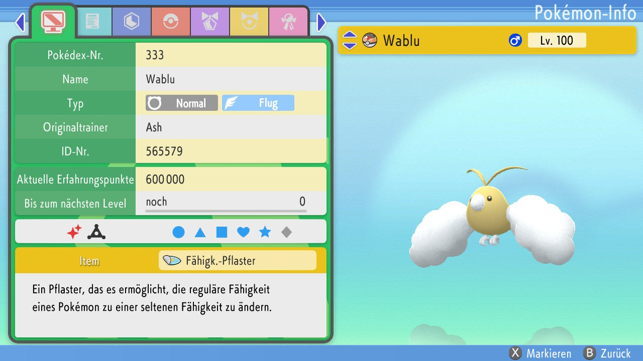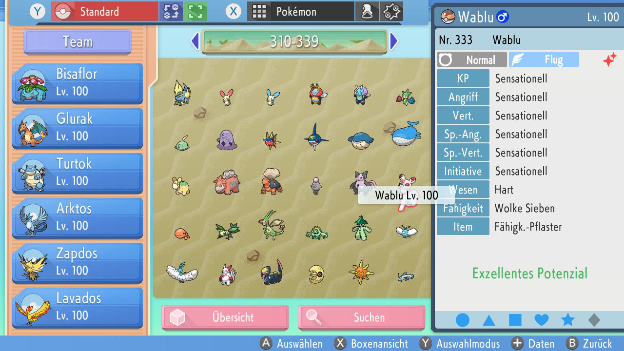 Das Pokemon ist mit beeindruckenden 6×31 IV-Werten ausgestattet. Das bedeutet, dass es auf allen sechs Werten (KP, Ang., Sp-Ang., Vert., Sp-Vert., Init.) die maximalen 31 IV/DV-Punkte besitzt. Dein Pokemon startet somit mit herausragender Stärke in digitale Kämpfe.