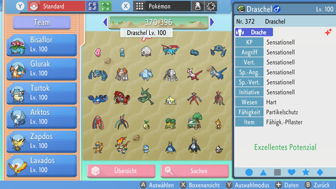 Das Pokemon ist mit beeindruckenden 6×31 IV-Werten ausgestattet. Das bedeutet, dass es auf allen sechs Werten (KP, Ang., Sp-Ang., Vert., Sp-Vert., Init.) die maximalen 31 IV/DV-Punkte besitzt. Dein Pokemon startet somit mit herausragender Stärke in digitale Kämpfe.
