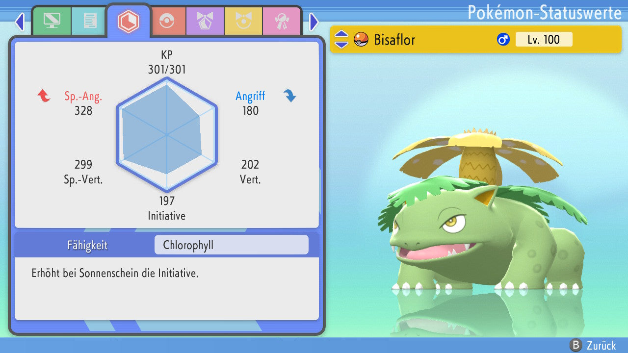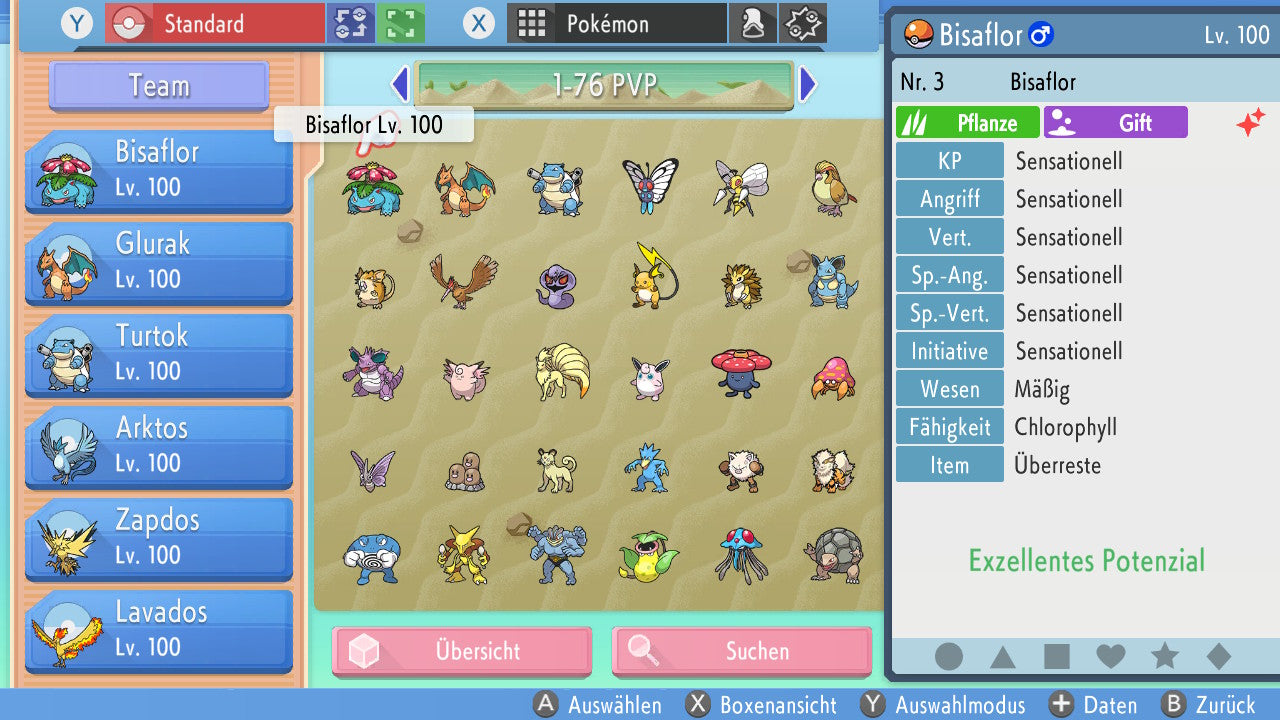 Das Pokemon ist mit beeindruckenden 6×31 IV-Werten ausgestattet. Das bedeutet, dass es auf allen sechs Werten (KP, Ang., Sp-Ang., Vert., Sp-Vert., Init.) die maximalen 31 IV/DV-Punkte besitzt. Dein Pokemon startet somit mit herausragender Stärke in digitale Kämpfe.