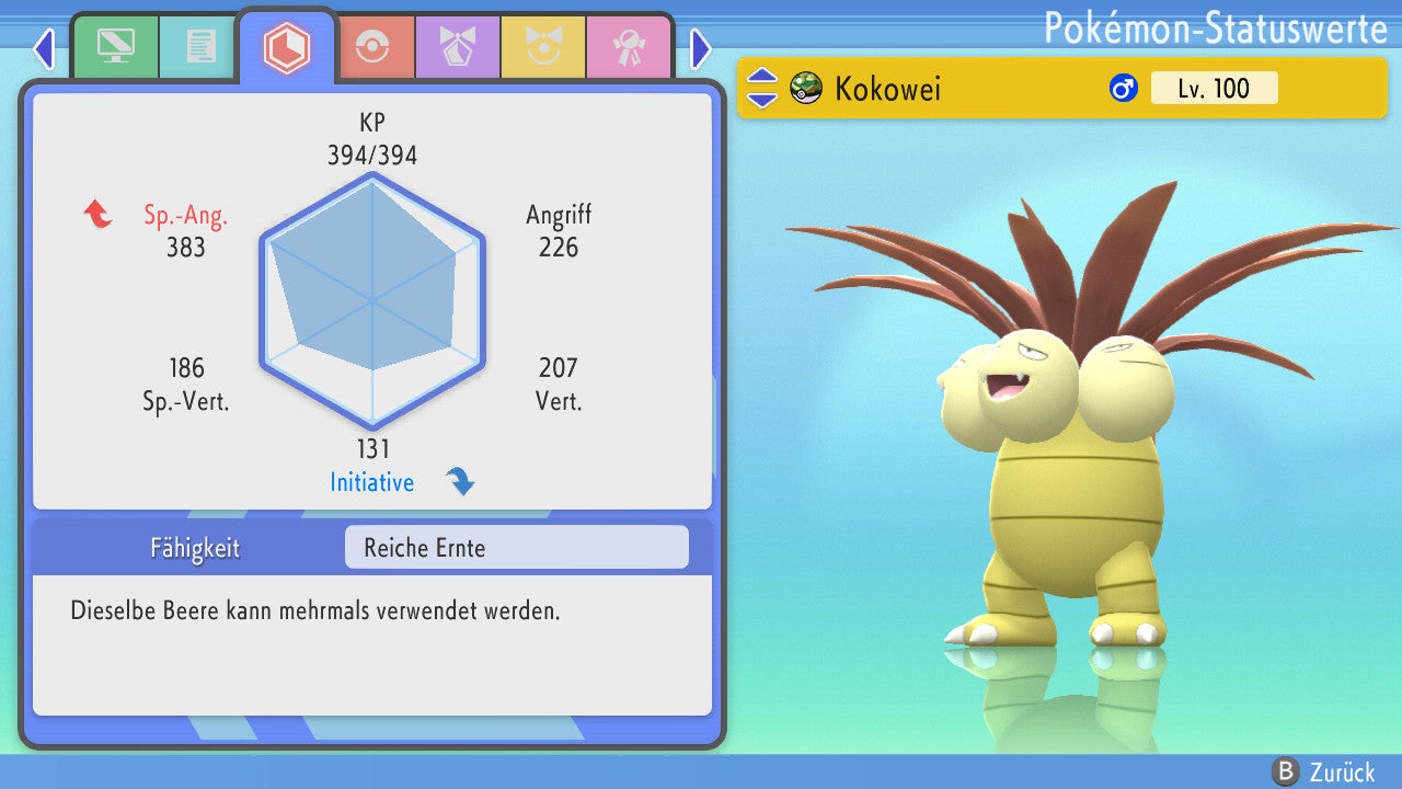 Das Pokemon ist mit beeindruckenden 6×31 IV-Werten ausgestattet. Das bedeutet, dass es auf allen sechs Werten (KP, Ang., Sp-Ang., Vert., Sp-Vert., Init.) die maximalen 31 IV/DV-Punkte besitzt. Dein Pokemon startet somit mit herausragender Stärke in digitale Kämpfe.