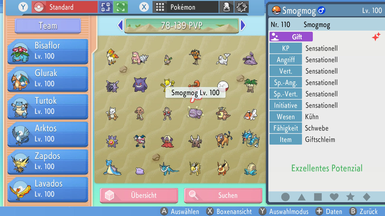 Das Pokemon ist mit beeindruckenden 6×31 IV-Werten ausgestattet. Das bedeutet, dass es auf allen sechs Werten (KP, Ang., Sp-Ang., Vert., Sp-Vert., Init.) die maximalen 31 IV/DV-Punkte besitzt. Dein Pokemon startet somit mit herausragender Stärke in digitale Kämpfe.