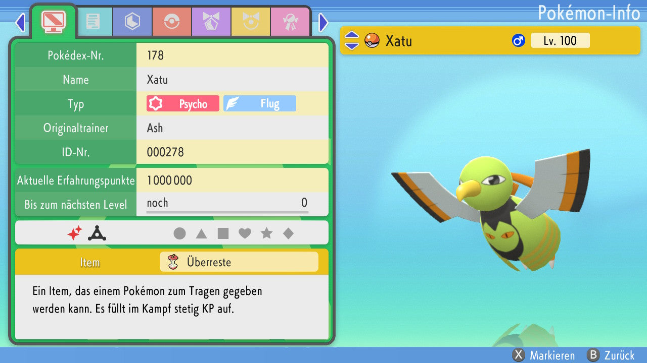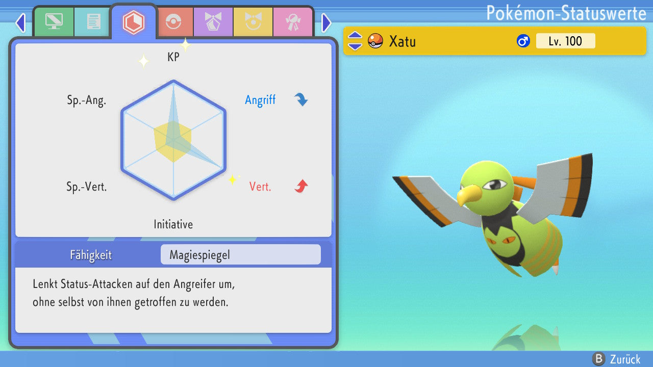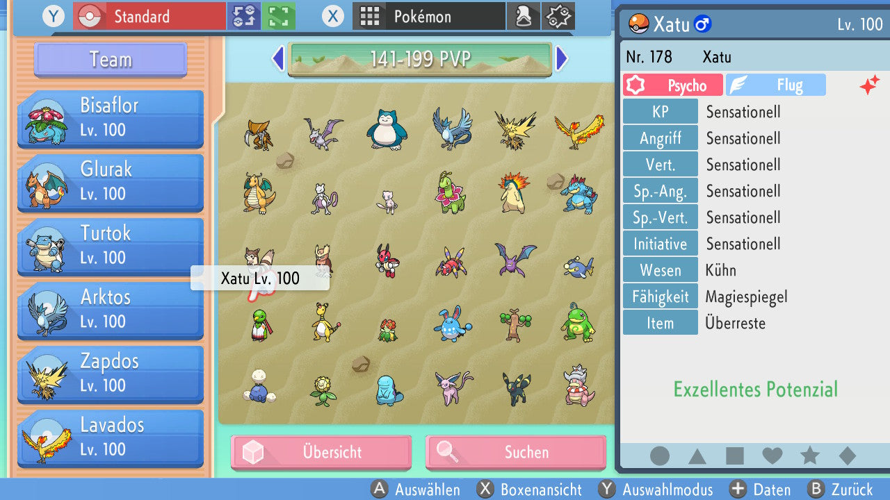 Das Pokemon ist mit beeindruckenden 6×31 IV-Werten ausgestattet. Das bedeutet, dass es auf allen sechs Werten (KP, Ang., Sp-Ang., Vert., Sp-Vert., Init.) die maximalen 31 IV/DV-Punkte besitzt. Dein Pokemon startet somit mit herausragender Stärke in digitale Kämpfe.