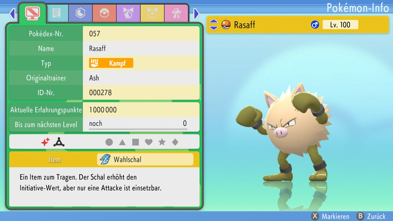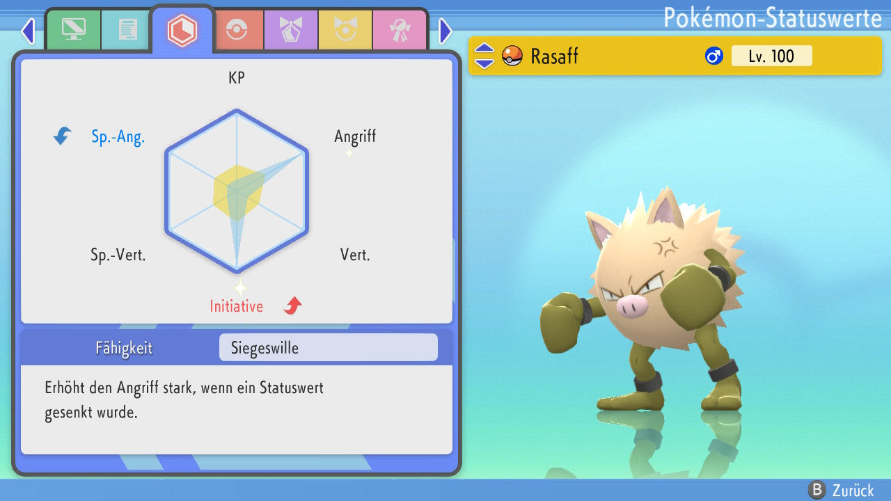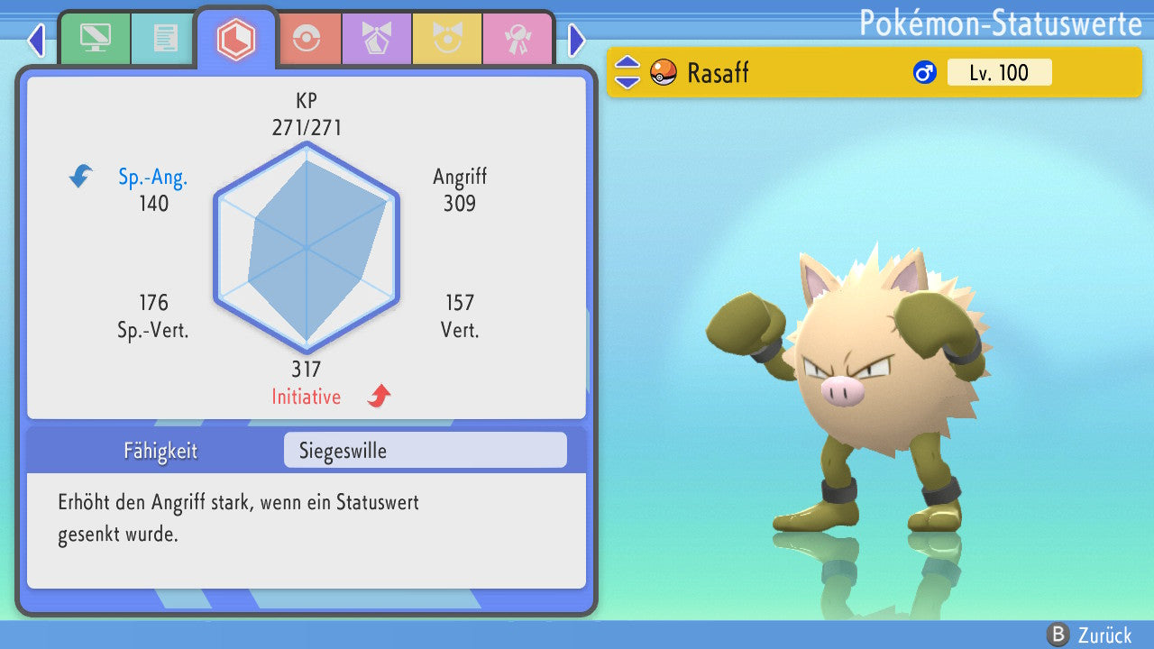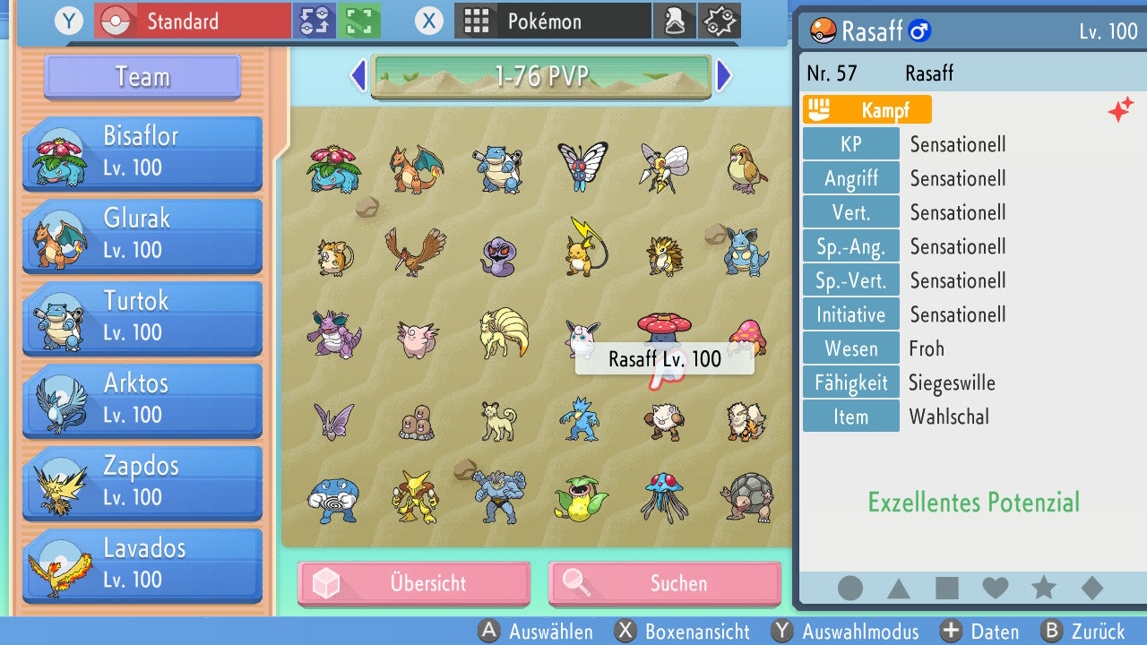 Das Pokemon ist mit beeindruckenden 6×31 IV-Werten ausgestattet. Das bedeutet, dass es auf allen sechs Werten (KP, Ang., Sp-Ang., Vert., Sp-Vert., Init.) die maximalen 31 IV/DV-Punkte besitzt. Dein Pokemon startet somit mit herausragender Stärke in digitale Kämpfe.