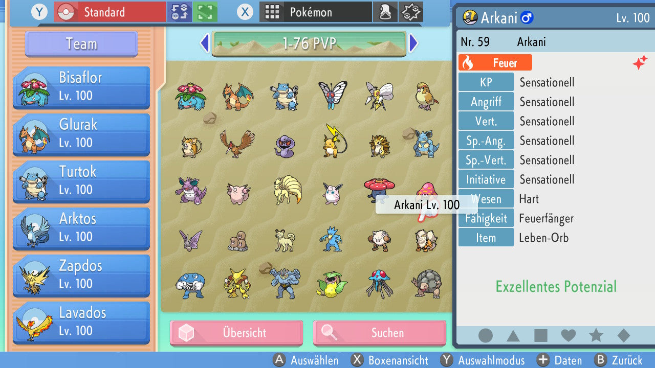 Das Pokemon ist mit beeindruckenden 6×31 IV-Werten ausgestattet. Das bedeutet, dass es auf allen sechs Werten (KP, Ang., Sp-Ang., Vert., Sp-Vert., Init.) die maximalen 31 IV/DV-Punkte besitzt. Dein Pokemon startet somit mit herausragender Stärke in digitale Kämpfe.