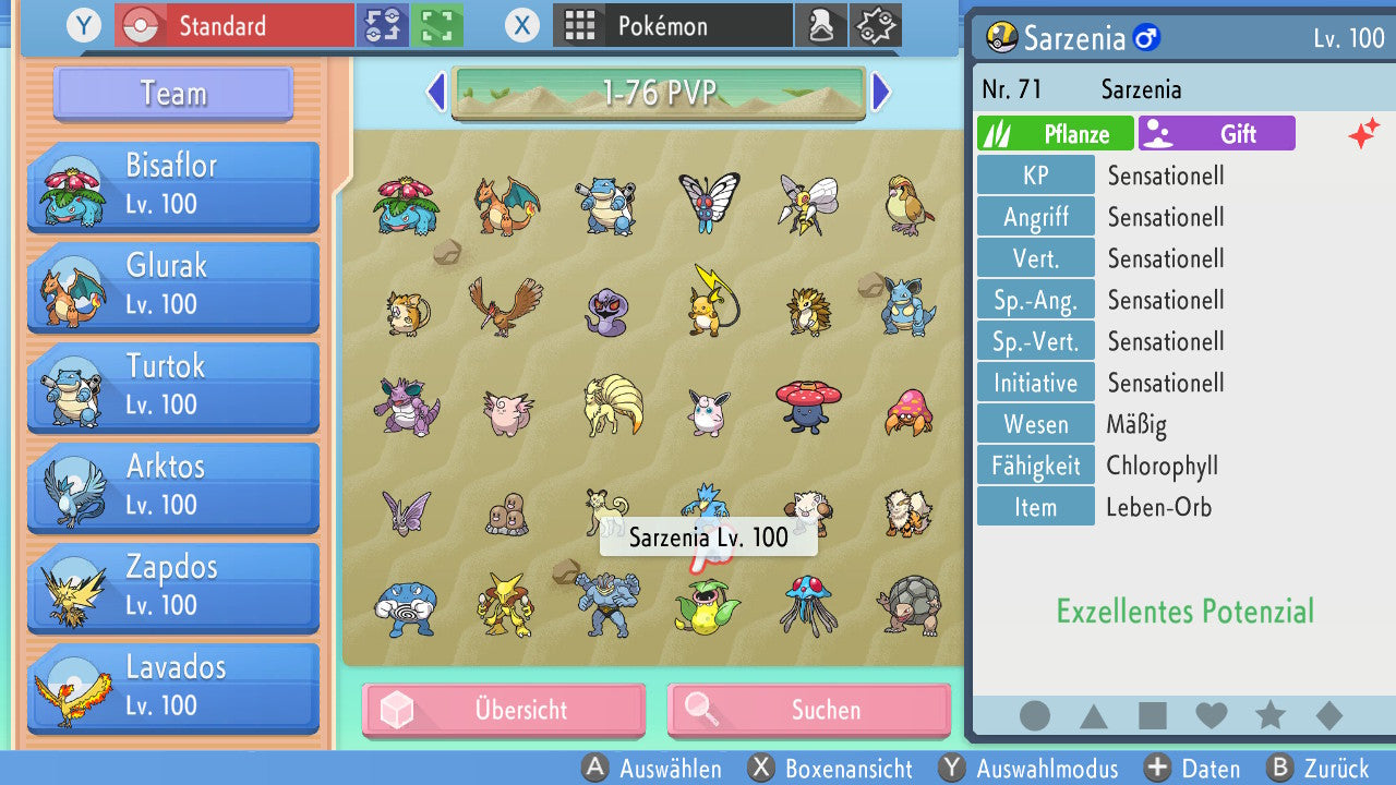 Das Pokemon ist mit beeindruckenden 6×31 IV-Werten ausgestattet. Das bedeutet, dass es auf allen sechs Werten (KP, Ang., Sp-Ang., Vert., Sp-Vert., Init.) die maximalen 31 IV/DV-Punkte besitzt. Dein Pokemon startet somit mit herausragender Stärke in digitale Kämpfe.